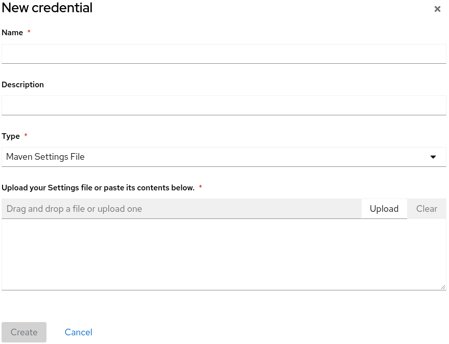 Tackle validates the input and creates a new credential. Maven settings.xml files must be parsed and checked for validity. If the validation fails, an error message displaying “not a valid key/XML file” is displayed.