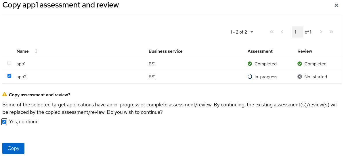 5. Click the checkbox of the application(s) to copy the assessment or assessment and review to.